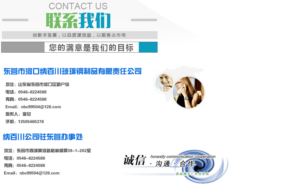 本着“一切为了产品服务,一切为了客户服务”的企业发展理念和“让客户享受到最低的消费,最可靠的质量,最优良的服务 ”的经营宗旨,凭借对玻璃钢产品和防腐行业的深刻理解,纳百川将领先业界的产品理念和丰富的产品开发经验相结合,为用户提供经济、快捷、安全、环保、实用的玻璃钢产品和应用解决方案。2012年,公司投资近300万元上线行业内部领先的数控设备,形成了直径4米缠绕管道的加工生产能力。2013年,公司研制成功了耐强酸强碱风机,攻克了困扰同行业近30年的裸露电机腐蚀难题,现已投放市场,得到了广大客户的一致认可和广泛好评。2014年,公司引进多组型拉挤设备及模具,形成了电缆支架、一次性成型子母扣地沟、电缆沟盖板、模压组合式化粪池等产品的快速生产能力。2011年至今,公司共承揽大小30余家油化企业和金属冶炼企业污水处理厂封闭和臭气处理工程,光解法和生物除臭等工艺发展成熟,污水池封闭工艺也在不断改进和提高。2012年至今,一直承担胜利油田十大采油厂检修及玻璃钢配套服务。